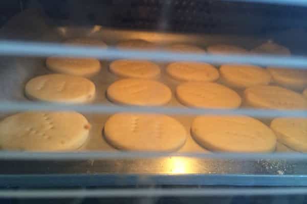 Ponemos a precalentar el horno a 150 grados y sacamos nuestra masa del refrigerador para empezar a cortar nuestras galletas. Yo las hago de aproximadamente 4 a 5 cms de diámetro. Las vamos poniendo en nuestra bandeja enmantequillada, las pinchamos con un tenedor en dos oportunidades y comenzamos a hornearlas. Dependiendo del grosor, el tiempo irá de los 10 a los 15 minutos.