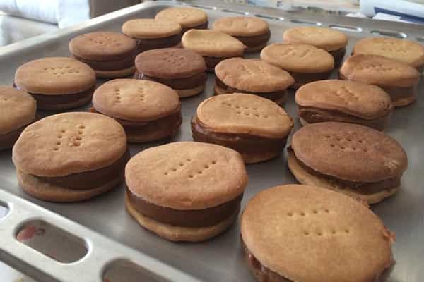 Una vez que nuestras galletas estén frías comenzaremos a unirlas con manjar. No sean tímidos con este ingrediente, uno de los secretos de este rico alfajor es la cantidad de manjar. Comiencen en el centro de la galleta poniendo manjar desde su bolsa y aprieten durante 3 segundos, lo que será suficiente para que nos quede una cantidad generosa de manjar entre nuestras galletas.