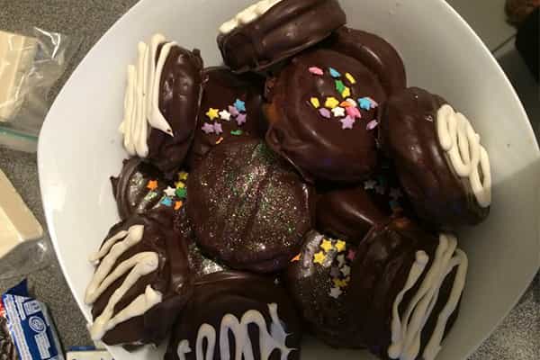 Una vez bañemos todos nuestros alfajores los colocaremos en papel mantequilla (para que el chocolate no se pegue) y le añadiremos la decoración a gusto y estaremos listos para disfrutar esta deliciosa receta.