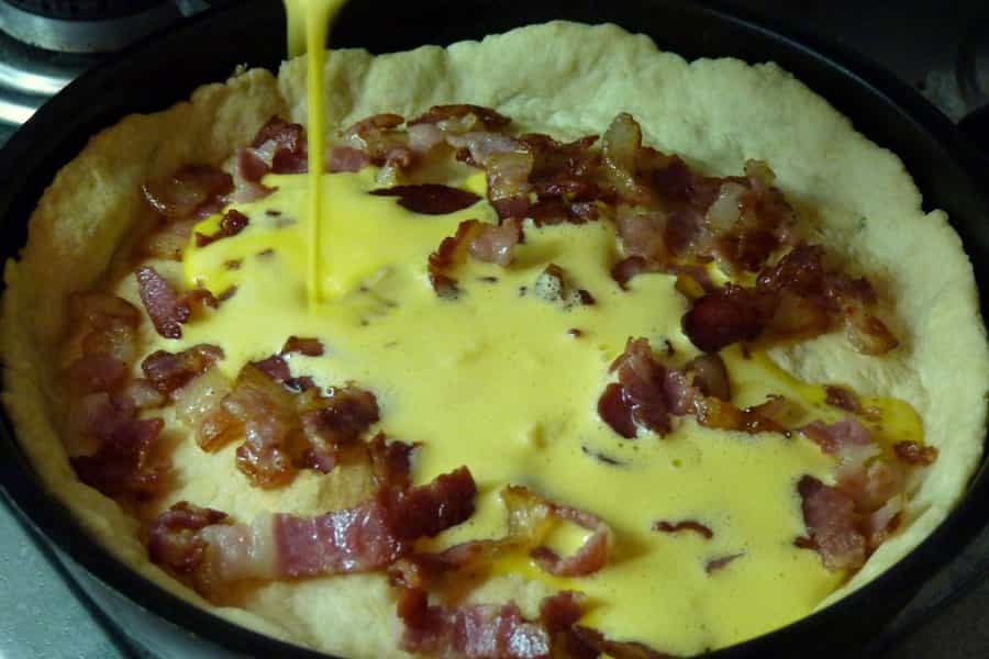 Precalentar el horno a 190C. En un molde apto para el horno esparce la masa en una capa delgada, cuidando formar los bordes hacia arriba. Pincha la masa con un tenedor en varios lugares para evitar que se infle. Cocer la masa por 10 minutos. Para el relleno. Corta el tocino en trozos pequeños y ponlo a cocer con un chorrito de aceite de oliva a fuego lento por 7 minutos o hasta que se doren. En un bowl batir los 2 huevos y las 2 yemas por 2 minutos, luego agregar la leche y los aliños y batir por otros 2 minutos. Agrega el queso y mezcla hasta que los ingredientes queden incorporados.