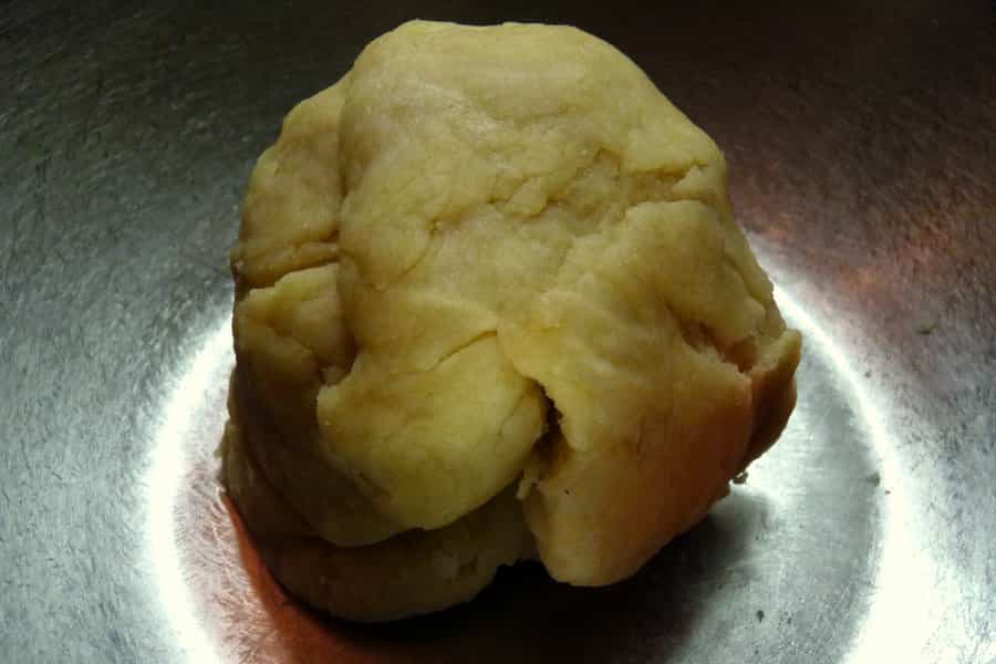 Para la masa. Derretir la mantequilla a baño maría en un bowl. Agregar la harina y sal y mezclar bien. Obtendrás unos gránulos de masa que no formarán una mezcla homogénea. Para lograrla debes agregar agua tibia de a poco y continuar amasando hasta obtener una bolita de masa. Si te pasas con la cantidad de agua que agregaste, pon un poco más de harina.