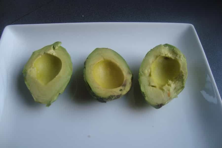 Pelar las paltas y sacar el carozo, salpimentar y bañarlas con unas gotas de jugo de limón.