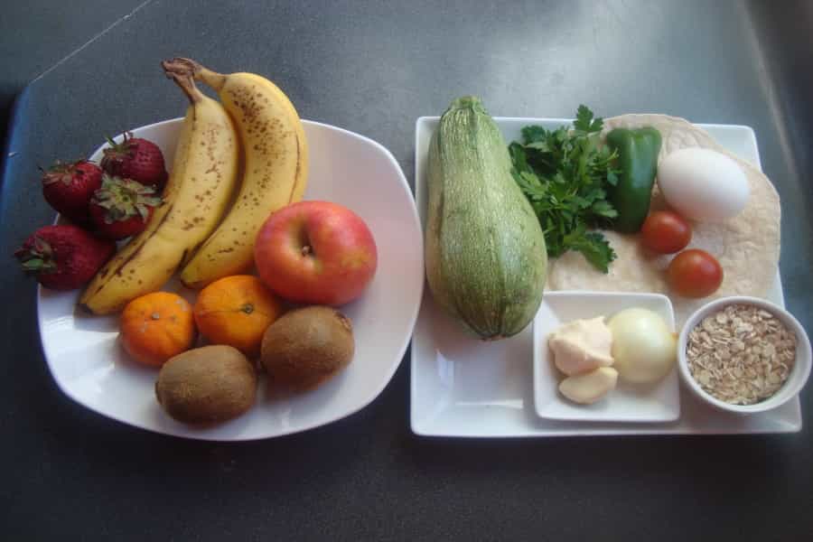 -2 zapallos italianos -100 gramos de queso crema -1 cebolla -3 cucharadas de perejil fresco picado -50 gramos de queso rallado -4 masas de tacos o 8 rebanadas de pan de molde -100 gramos de queso crema -1 pimentón -½ cebolla -1 diente de ajo -6 tomates cherry o 1 tomate -1 plátano -½ taza de avena -3 claras de huevo -½ cucharadita de polvos de hornear -1 kilo de fruta fresca (manzana, plátano, frutillas, kiwis, durazno, pera) -Azúcar o endulzante -Agua mineral -Aceite de oliva -Sal – Merquén Preparación Para las paletas de plátano con avena: pelar el plátano y cortar en rodajas de 1 centímetro. En un recipiente mezclar las claras batidas, la avena, el polvo de hornear y azúcar o endulzante a gusto.