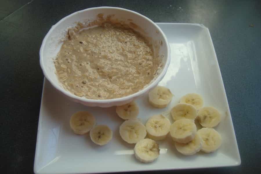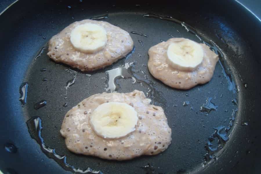 En un sartén con unas gotas de aceite caliente colocar una porción de la mezcla dándole la forma de un círculo, en el centro colocar una rodaja de plátano, cocinar por 1 minuto, con una cuchara agregar un poco de mezcla sobre el plátano (la idea es tapar el plátano), dar vuelta la paleta y cocinar por 1 minuto por el otro lado.