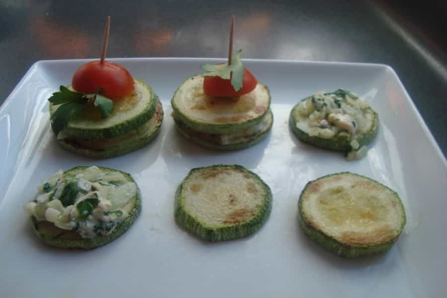 Retirar y colocarlas en un papel absorbente. Preparar el relleno mezclando en un recipiente 100 gramos de queso crema, perejil picado y 1 cebolla picada finamente, sazonar a gusto. Para armar los montaditos, disponer una rodaja de zapallito, sobre ella colocar una cuchara de la pasta preparada, tapar con otra rodaja de zapallito. Insertar un mondadientes con medio tomate cherry.