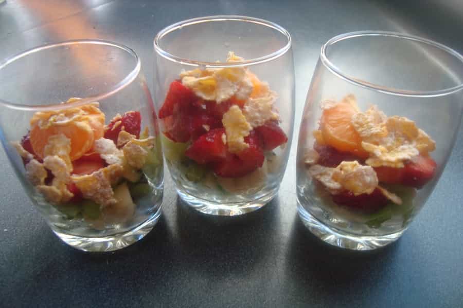 Para los vasos de frutas: lavar, pelar, eliminar las cascaras y las hojas, picar la fruta en cubos, disponer la fruta picada en vasos, espolvorear con cereal y miel.