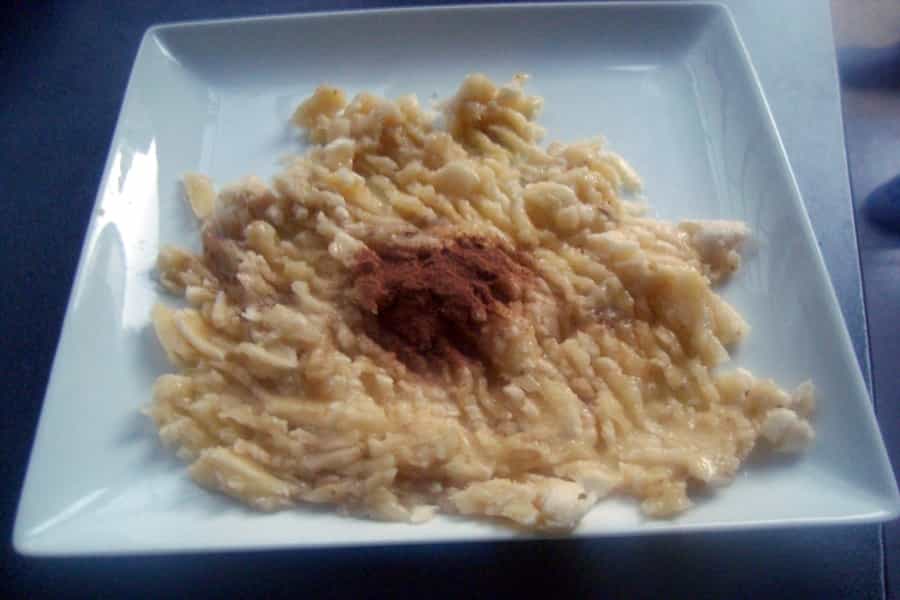 Pelar los plátanos. En un recipiente molerlos y añadir ¼ cucharadita de canela en polvo.