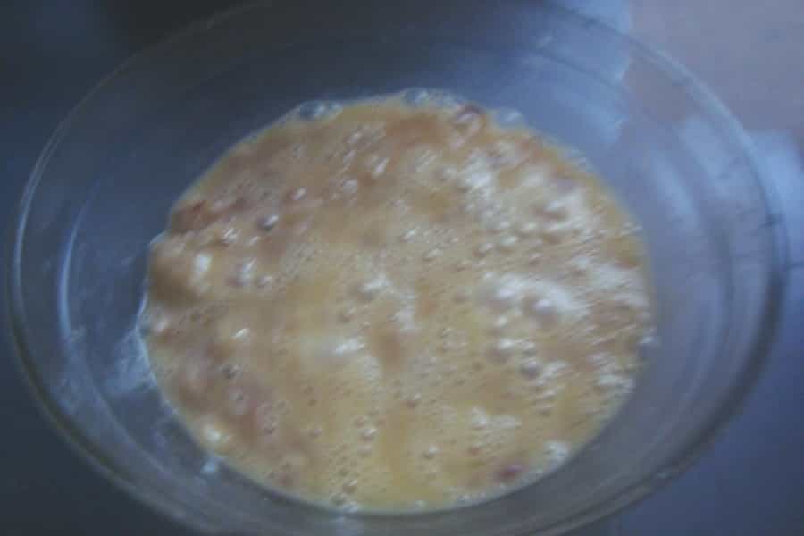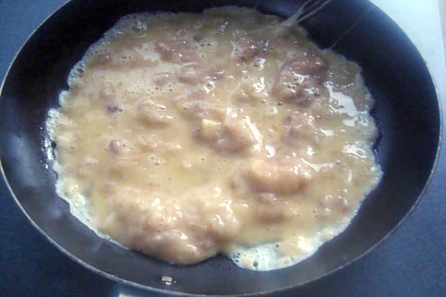 En un pocillo batir los huevos con un tenedor. Incorporar los huevos batidos a los plátanos molidos, mezclar suavemente hasta integrar bien.