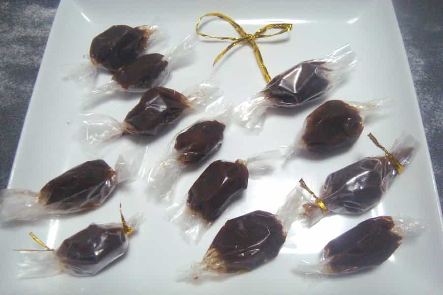 Con un cuchillo húmedo realizar algunos cortes para dar la forma a los caramelos. Dejar que la mezcla se solidifique por completo, separar los caramelos.