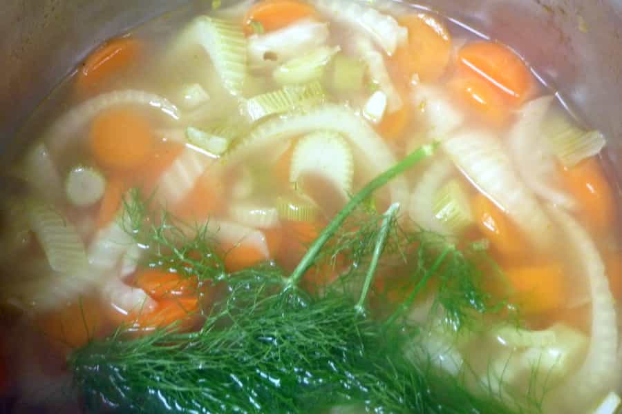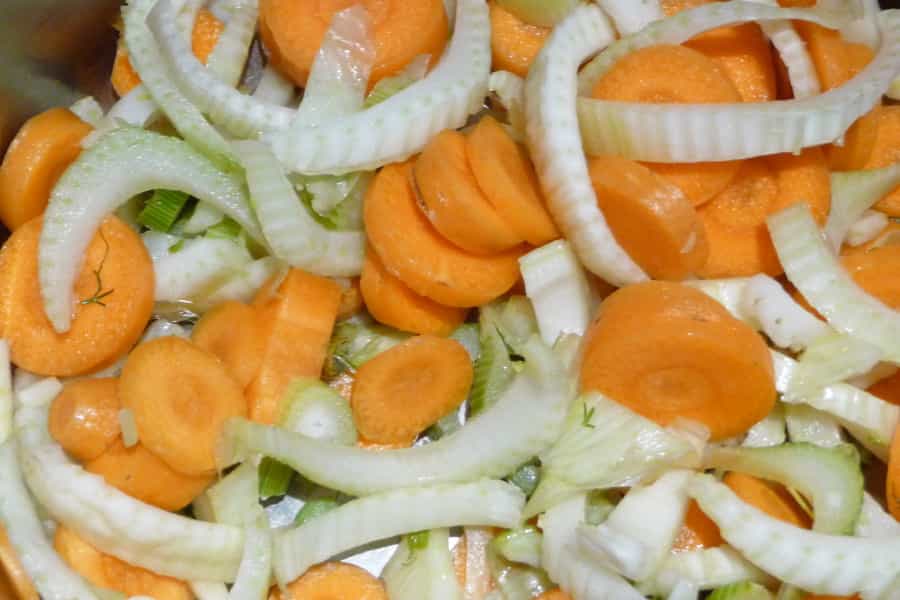 Corta el hinojo en trozos, reserva las hojas, y haz lo mismo con las zanahorias peladas. Pon un poco de aceite en una olla y saltea el hinojo, luego incorpora las zanahorias.