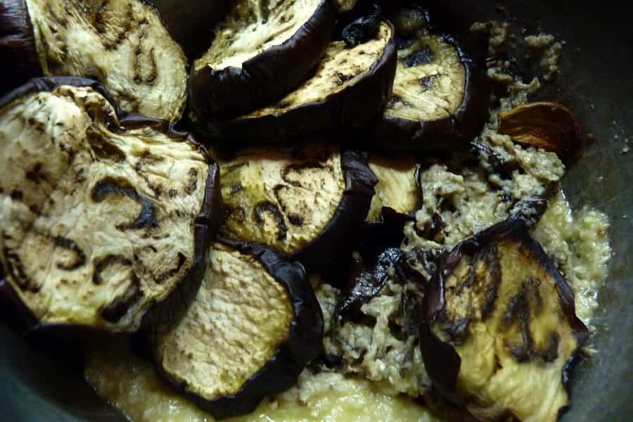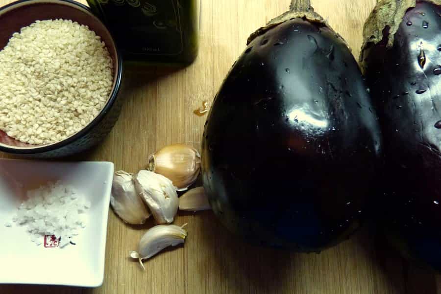 Una vez que las berenjenas estén cocidas, mezclarlas con la pasta de sésamo en un procesador de alimentos y moler hasta conseguir una pasta homogénea.