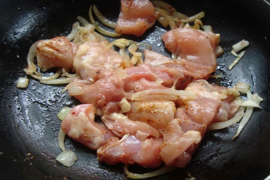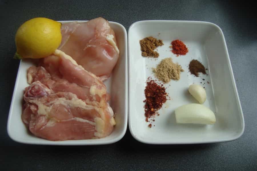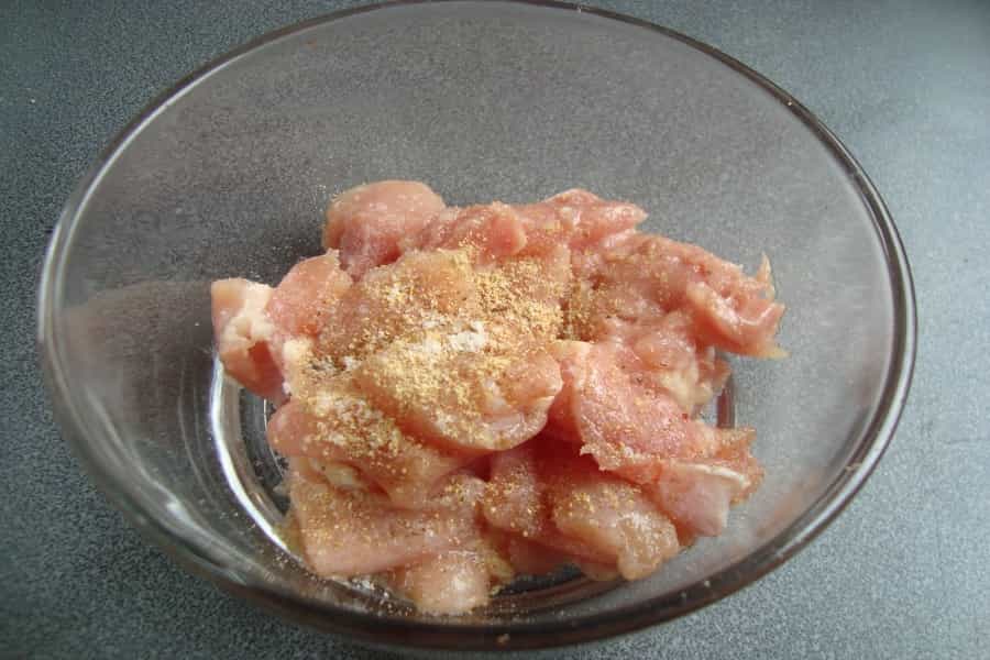 Eliminar la piel del pollo, deshuesarlo, eliminar toda la grasa y picarlos en cubos. Colocar el pollo en una fuente e incorporar jengibre molido y comino, agregar aceite de oliva y salpimentar a gusto. Mezclar, tapar y refrigerar, dejar macerar por 30 minutos.