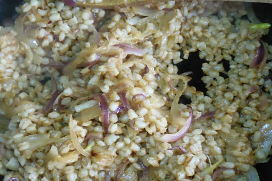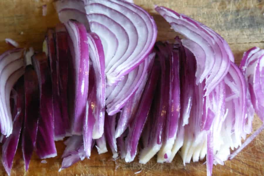 Luego picamos la cebolla en pluma y la agregamos al ajo.
