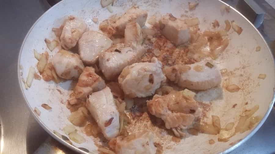 Pica la cebolla bien pequeñita y sofríela junto al ajo machacado, Cuando estén dorados coloca el pollo y cocínalo hasta que esté bien dorado.