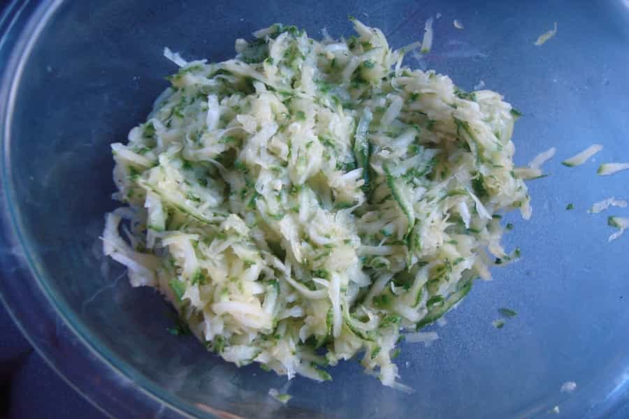 Lavar el zapallo italiano, eliminar los extremos y rallarlo en tiras gruesas.