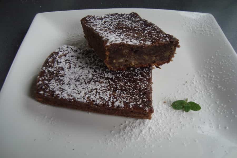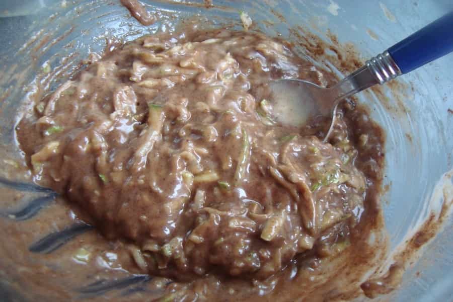 En un recipiente mezclar aceite y azúcar rubia, batir, agregar uno a uno los huevos, seguir batiendo por 2 minutos. Incorporar el zapallo italiano rallado y con ayuda de una cuchara de madera mezclar bien, añadir harina, chocolate, sal, canela y frutos secos. Mezclar suavemente hasta obtener una mezcla homogénea.