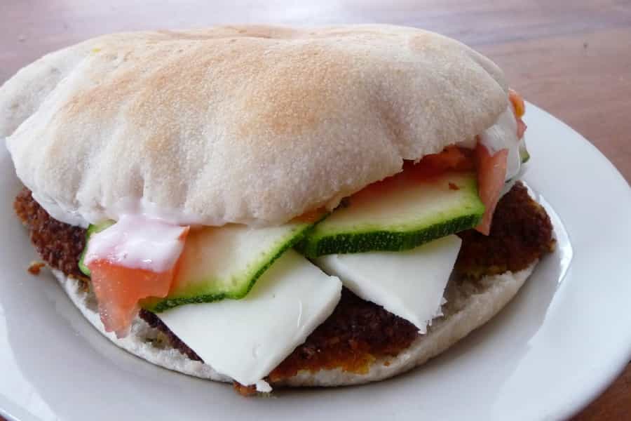 Abre cuidadosamente tu pan pita, pon los falafel cortados horizontalmente, luego el queso de cabra, el tomate, las láminas de zapallo italiano y finalmente la salsa.