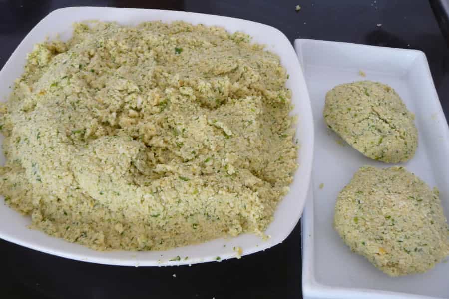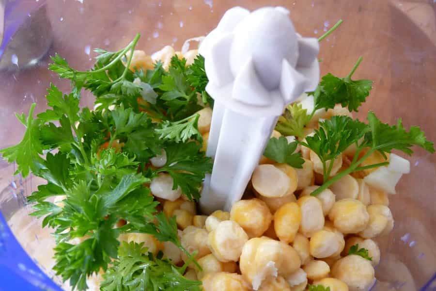 Para hacer el falafel, deja remojando los garbanzos al menos 6 horas. Cuélalos y muélelos en tu procesadora, con la cebolla y el perejil.