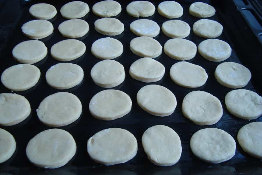 Espolvorear una mesa limpia con maicena y estirar la masa (dejarla de 1 centímetro de grosor), cortar las galletas (puede ser con un vaso o cortante). Distribuir las galletas de coñac en la lata de horno previamente enmantequillada.