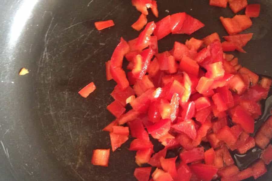 Mientras, prepara el choclo según las instrucciones del paquete (yo los compré congelados) y pon un rato en aceite el pimentón rojo picado en cuadritos.