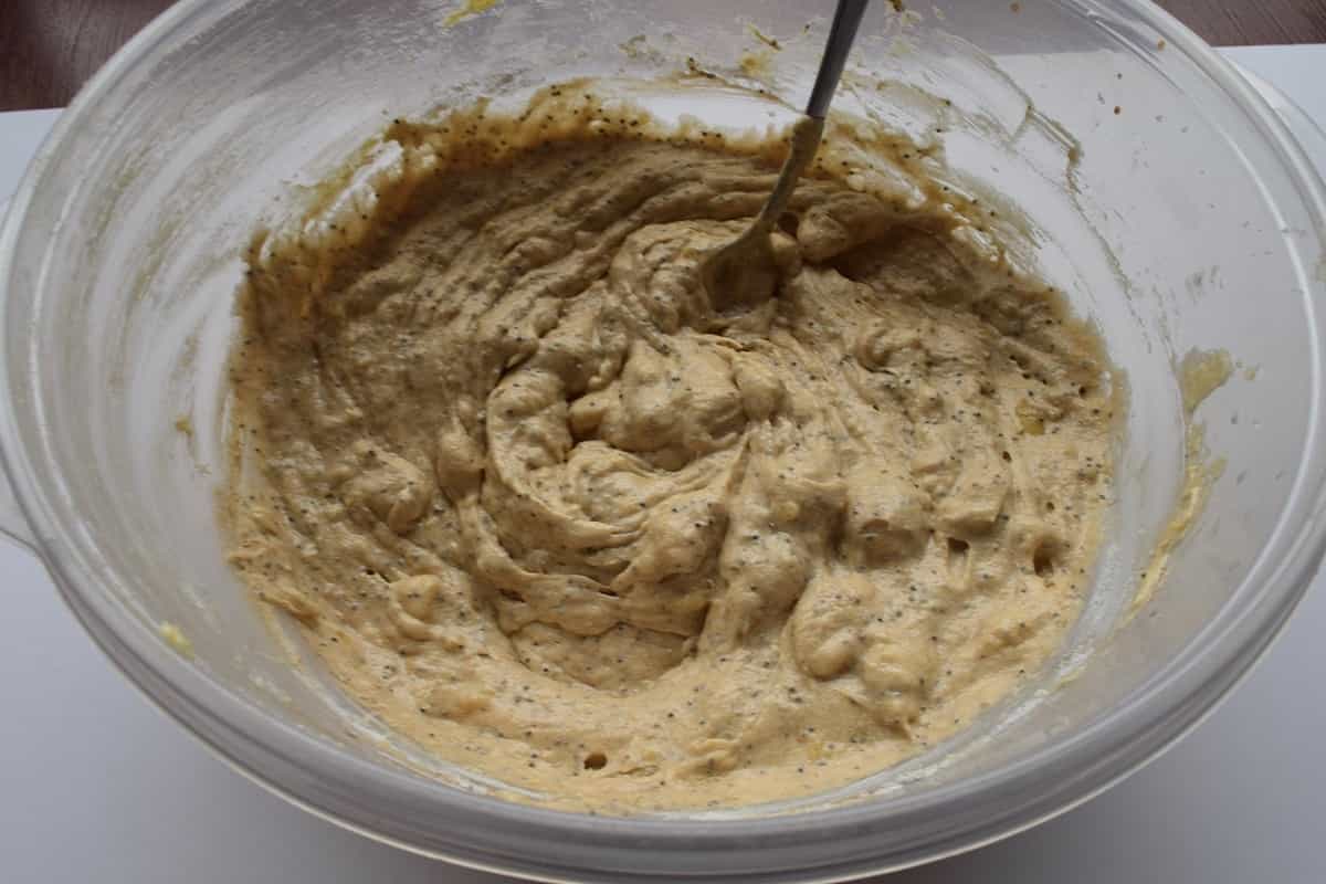 La banana restante hay que cortarla en rodajas y agregarla junto con la canela, las semillas de amapolas y la ralladura de limón. Entre ingrediente e ingrediente, van a tener que ir mezclando.