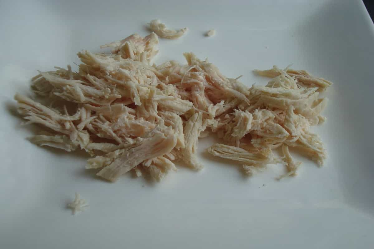 Con ayuda de un tenedor desmechar el pollo cocido. Reservar.