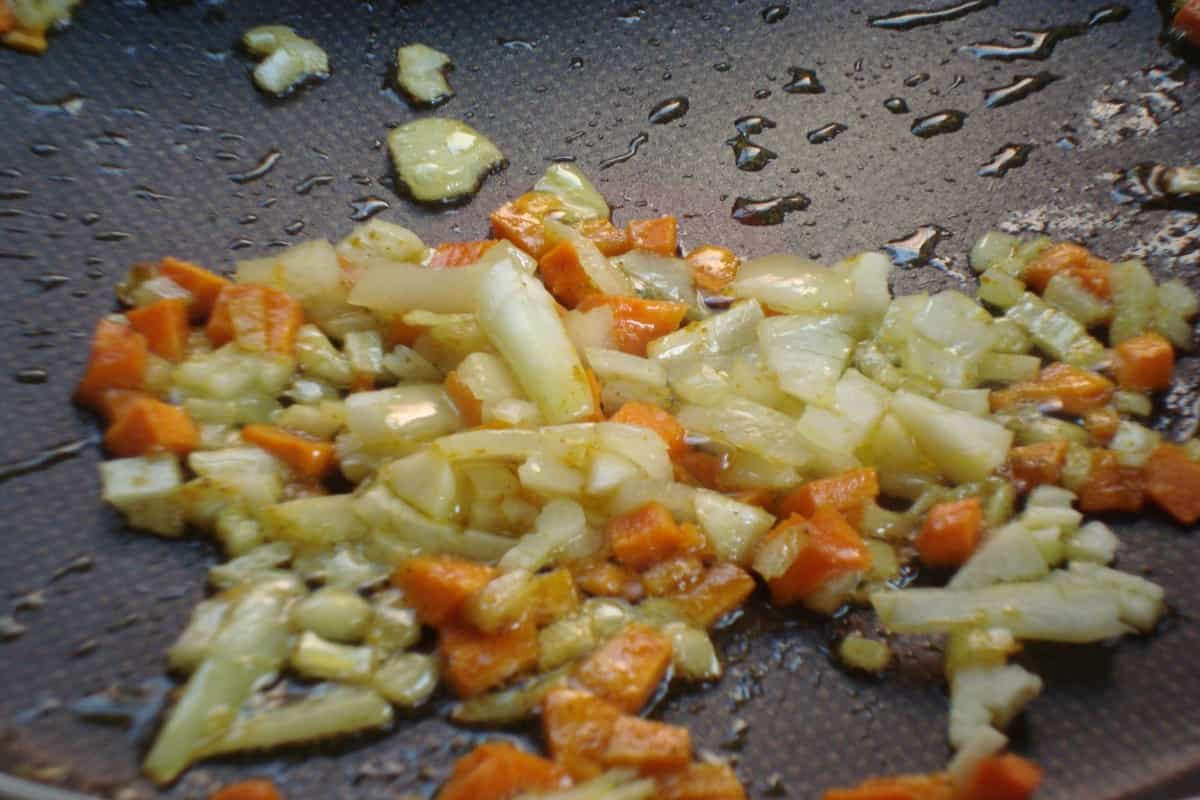 En una olla con 2 cucharadas de aceite de oliva caliente, sofreír a fuego medio por 5 minutos la cebolla picada. Añadir los ajos junto con la zanahoria pelada y cortada en cuadrados pequeños. Cocinar por 2 minutos.