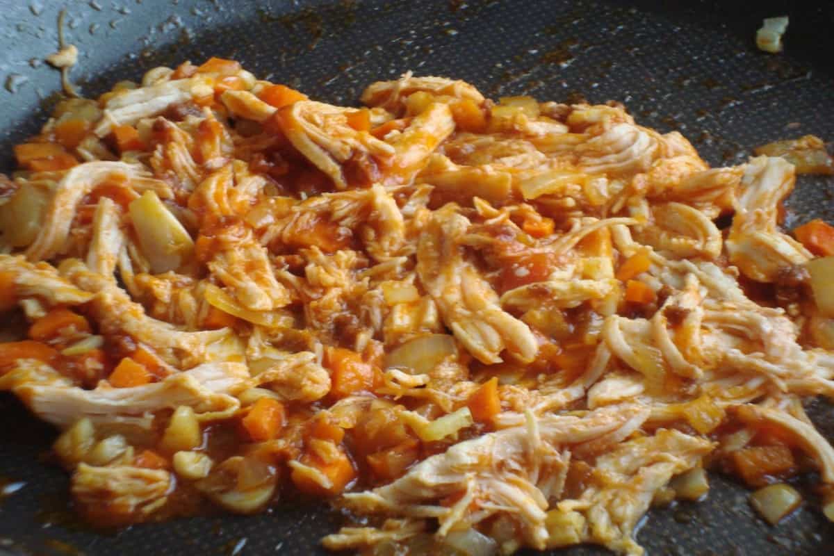 Incorporar la salsa de tomates o el tomate rallado y el pollo desmechado. Sazonar con cúrcuma, comino, sal y pimienta. Agregar 1 taza de caldo de pollo o agua, cocinando a fuego medio por 15 minutos.