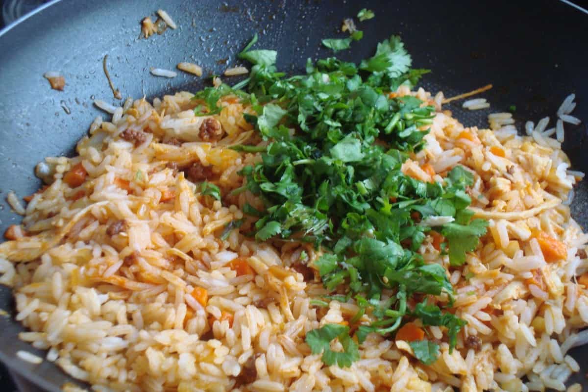Cuando el arroz esté listo, mezclarlo con el pollo y el cilantro picado. Cocinar por 10 minutos o hasta que el arroz se seque. Apagar y servir.