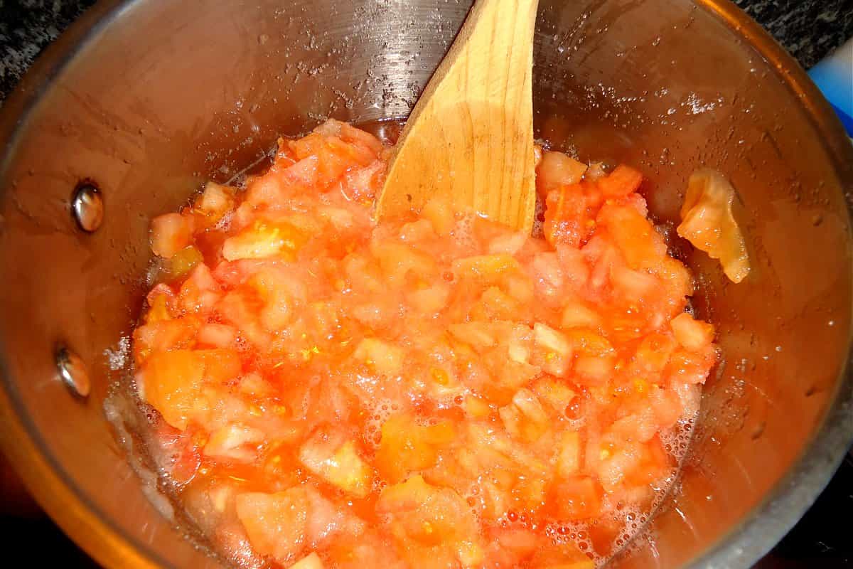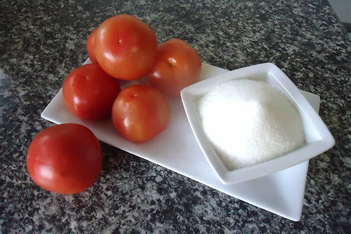 Pelar los tomates, quitarles las pepas y cortarlos en cubos. Poner en una olla los tomates y el azúcar; cocinar a fuego medio y revolver constantemente