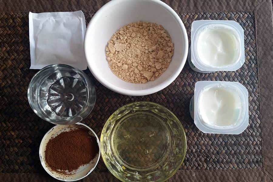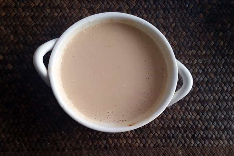 Una vez que tengas bien disuelta la gelatina, la mezclas en un recipiente con los yogurts naturales. Revuelves por al menos 1 minuto y agregas ½ cucharada de café en polvo. Verás que quedará un líquido de color café claro.