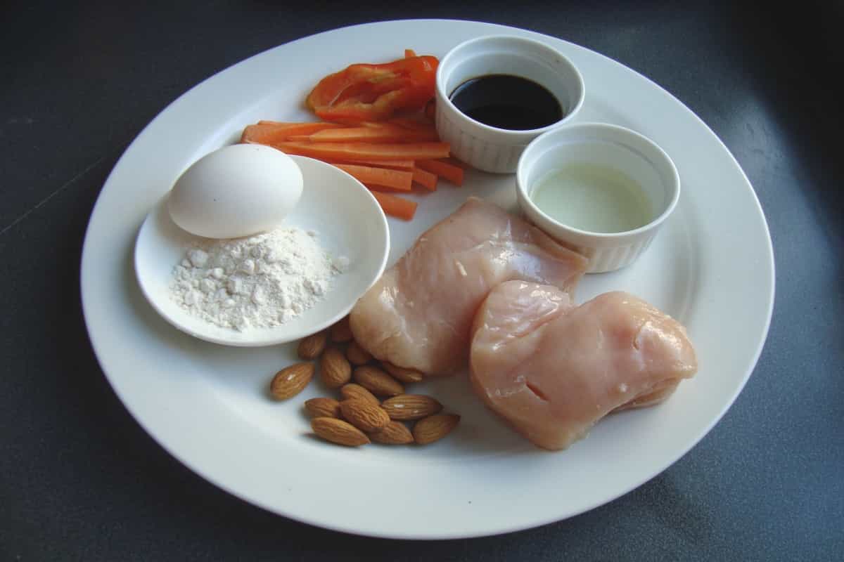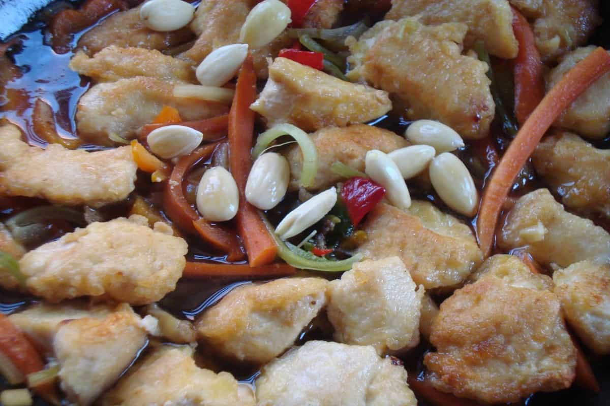 En el mismo sartén, saltear a fuego medio por dos minutos la zanahoria y el pimentón, todo cortado en tiras. Añadir la salsa de soya y mezclar. En un poco de agua o de caldo frío, disolver una cucharada de maicena e incorporarla al sartén. Revolver y añadir los cubos de pollo y las almendras peladas, mezclando suavemente. Cocinar por 3 minutos.