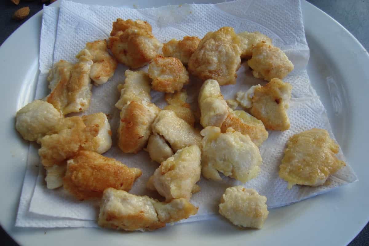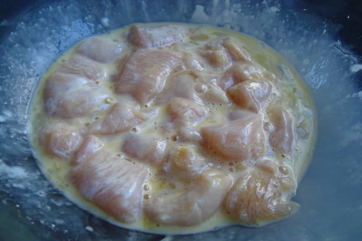 En un recipiente batir una clara de huevo. Añadir maicena y vino blanco, revolviendo hasta formar una especie de batido. Introducir los cubos de pollo y dejar reposar por 15 minutos. Transcurrido el tiempo de reposo, escurrirlo y reservar.