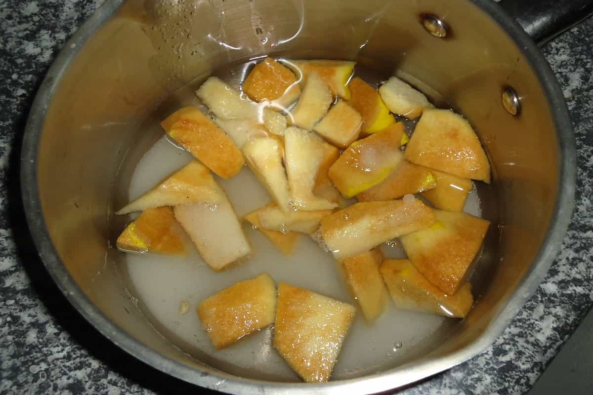 Pelar el membrillo, quitarle las pepas y cortarlo en trozos pequeños.