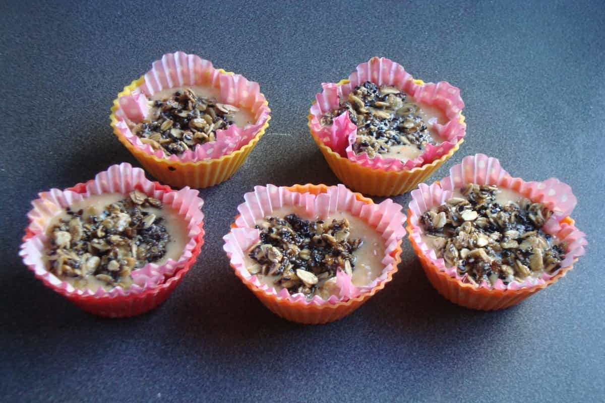 En un sartén derretir 2 cucharadas de mantequilla, añadir azúcar morena, miel y semillas; revolver hasta formar una pasta homogénea. Dejar enfriar. Distribuir el topping de semillas en los muffins.