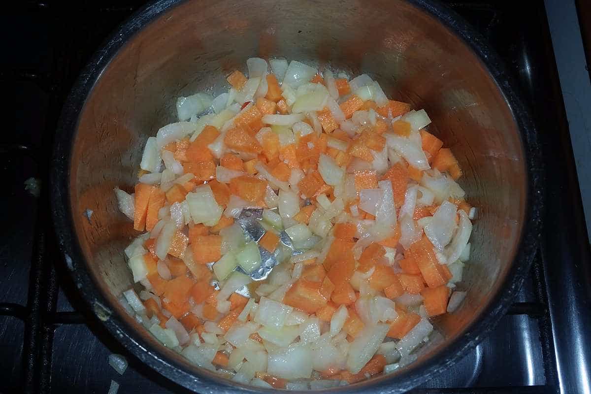 Posteriormente, diluimos en una olla una cucharada de aceite y sofreímos la zanahoria con la cebolla y el ajo.