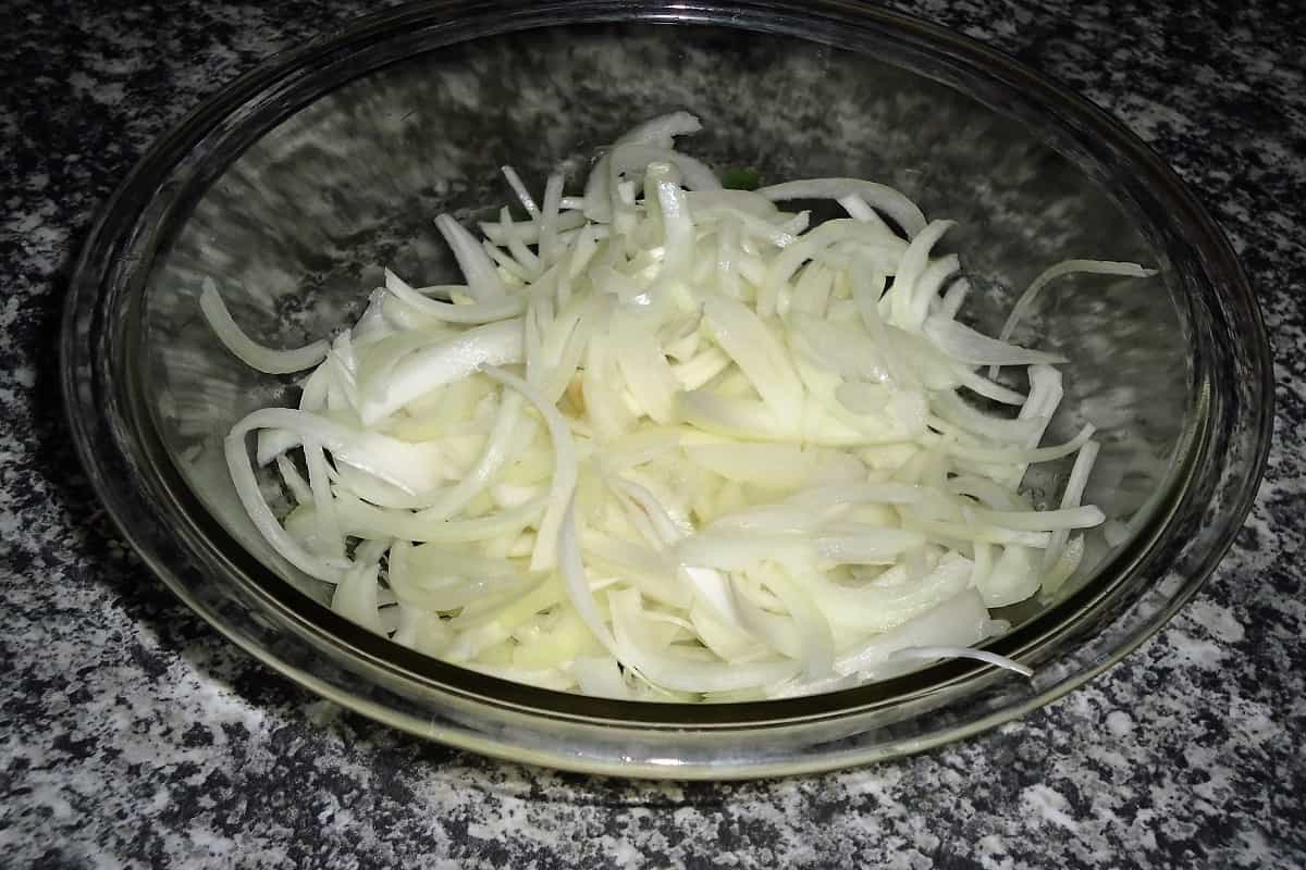 Pon la cebolla cortada en pluma en un recipiente y agrégale una cucharada de azúcar y otra de sal. Mezcla para impregnar toda la cebolla. Luego, lava con abundante agua.