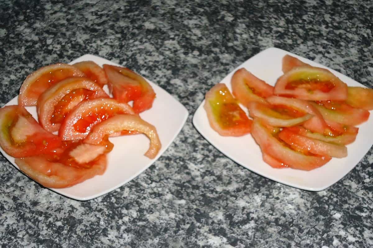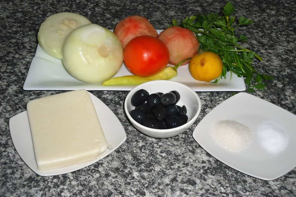 Para montar el plato, pon una base de cebolla, luego agrega los gajos de tomate, el queso y las aceitunas. Espolvorea el cilantro picado fino y el ají verde.