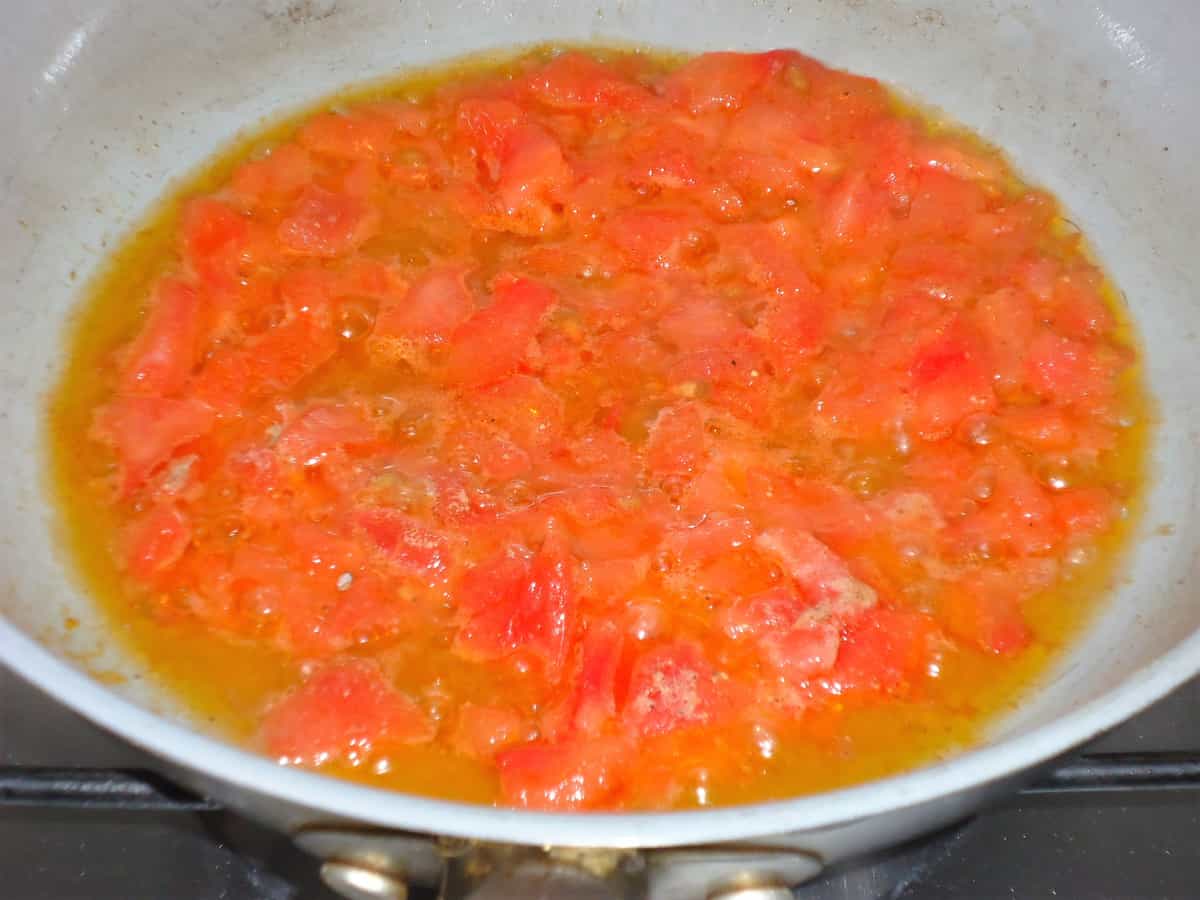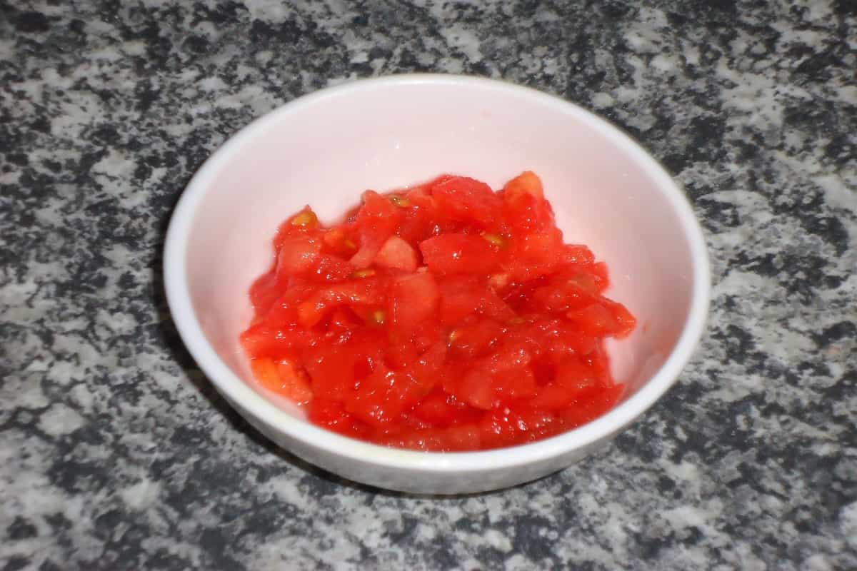 Comencemos cortando el tomate en trozos pequeños, luego reservemos.