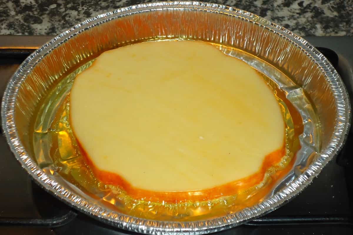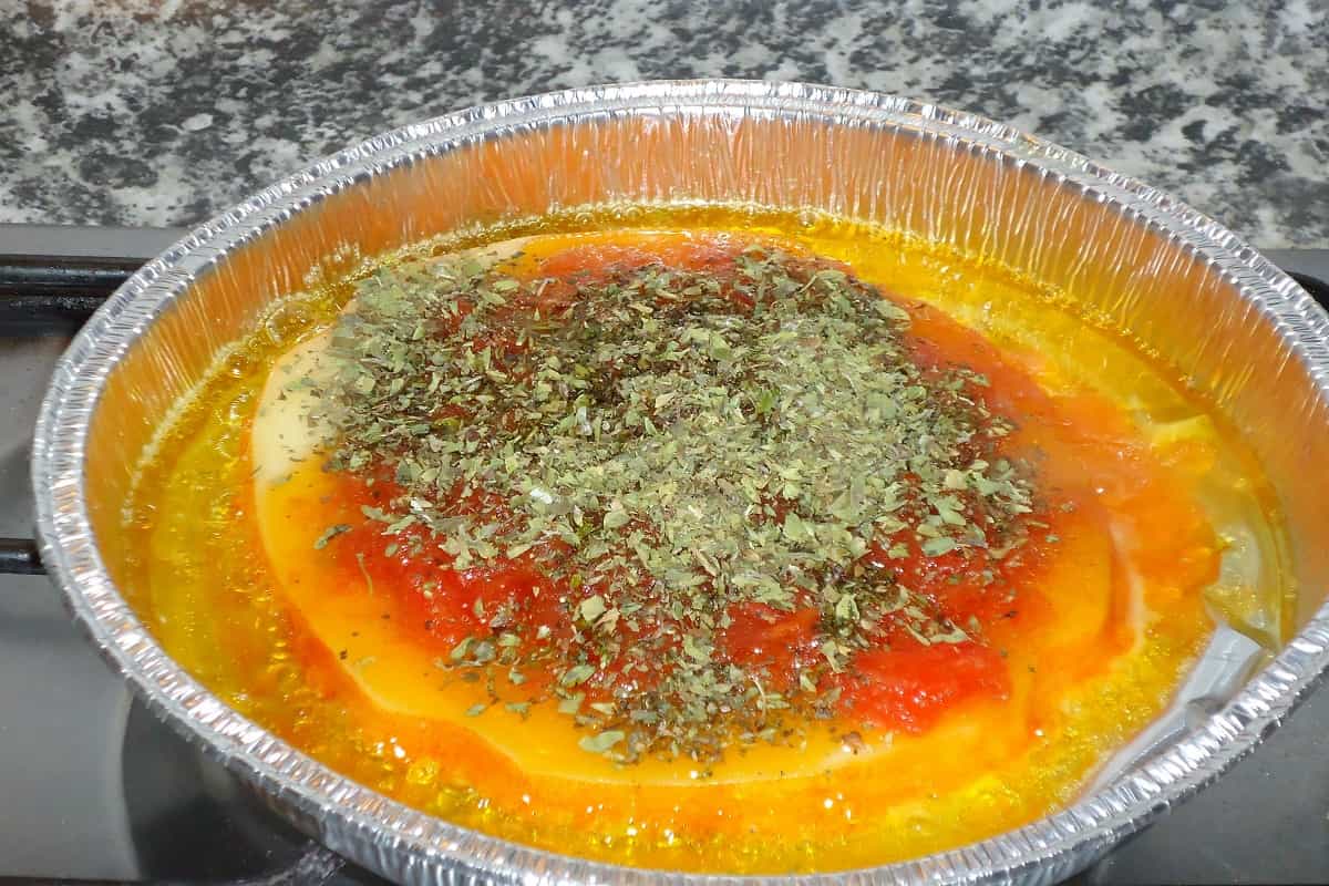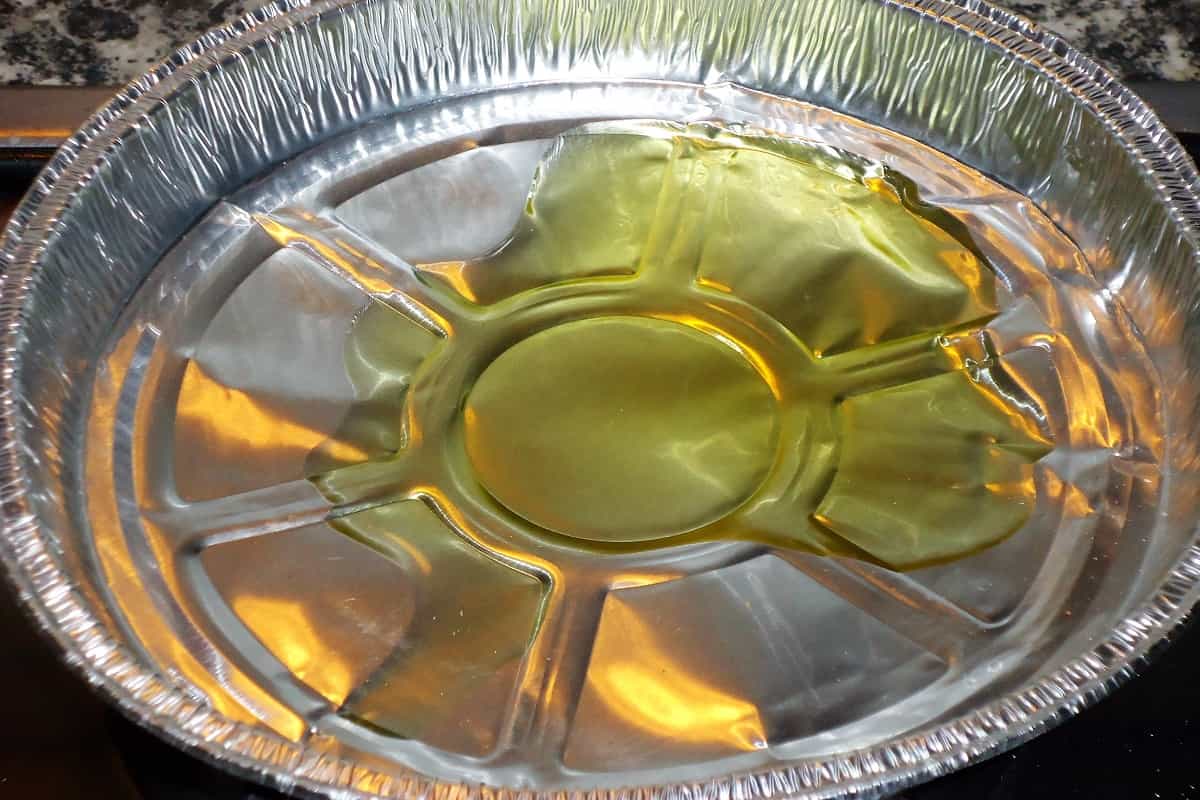 En un sartén grueso (idealmente uno que pueda ir a la mesa) calienta 2 cucharadas de aceite de oliva. Yo utilicé una bandeja de papel aluminio.