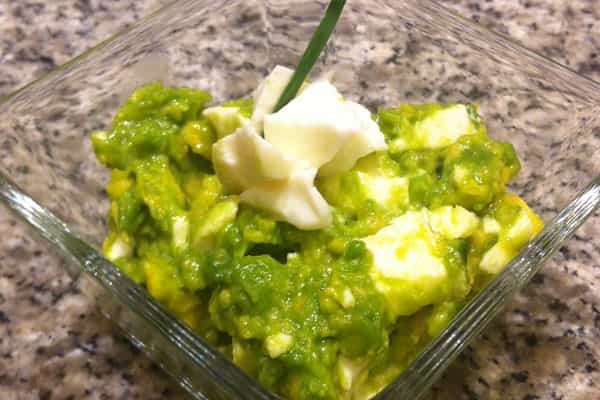 Ingredientes: - 2 paltas medianas - 100 gr de queso fresco - 1 pqte de cebollín - 1 cucharada de jugo limón - Aceite de oliva - Sal Preparación: Lava ambas paltas. Córtalas por la mitad y saca cuidadosamente el cuesco de cada una de ellas con ayuda de un cuchillo. (No olvides repetir este paso en cada uno de las versiones). En un bowl, aplasta la palta con un tenedor, procurando dejar pequeños trozos sin moler. En un plato, muele levemente el queso fresco, reservando pequeños trocitos. El queso molido únelo a la palta, condimenta con aceite de oliva, jugo de limón y sal. Rocía sobre este guacamole el queso en trozos. 2) Guacamole con palta trozada, cebollín y limón