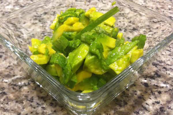 Ingredientes: - 2 paltas medianas - 1 cebollín pequeño - ½ limón - Aceite de oliva - Sal Preparación: Corta las paltas por la mitad y retira el cuesco. Pícala en pequeños cuadritos y resérvala en un bowl. Agrega la parte verde del cebollin finamente picado. Añade el jugo de limón, sal y aceite de oliva a gusto. 3) Guacamole picante