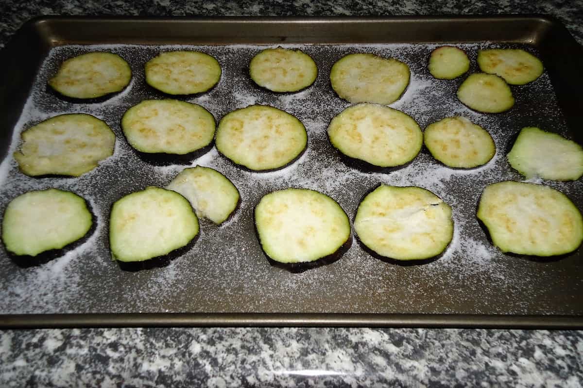 Corta las berenjenas en rodajas delgadas, ponlas sobre una fuente y agrega sal. De esta forma quitaremos el sabor amargo.