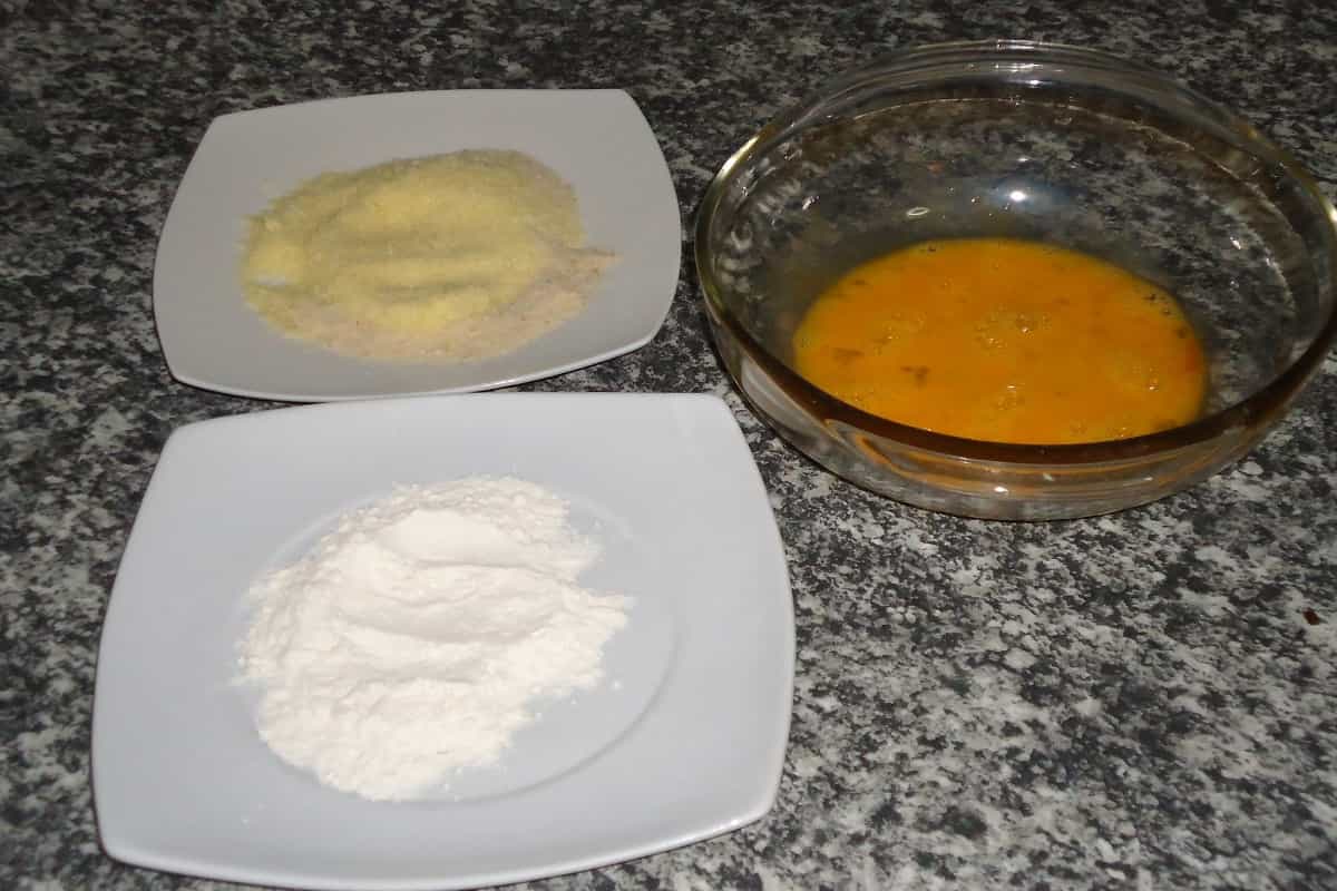 Ahora ya ponemos comenzar a freír nuestras berenjena. Para ello, mezcla en un recipiente el pan rayado con la sal, pimienta y queso parmesano. En otro bowl bate los huevos. Finalmente, en un plato pon el harina