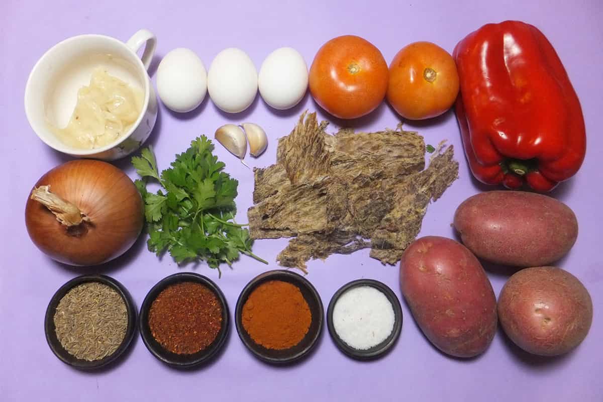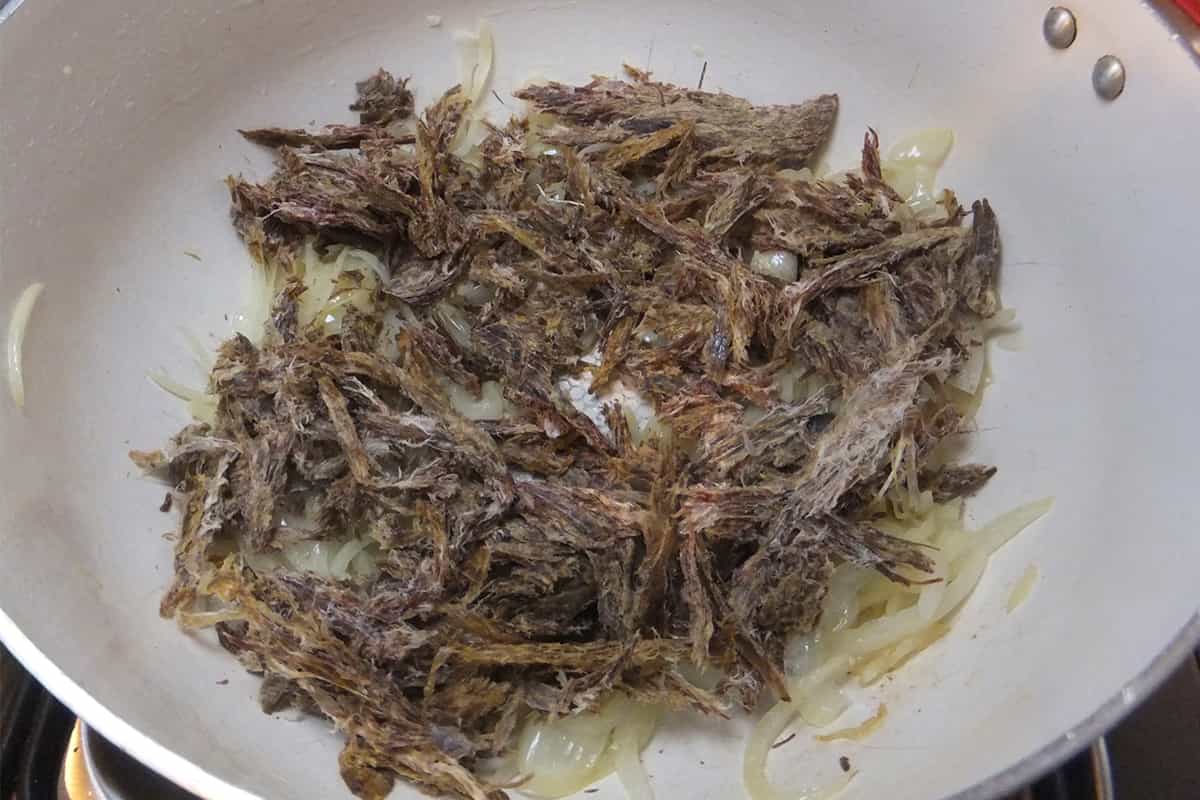 Esperamos hasta que esté transparente y agregamos el charqui previamente desmenuzado en trozos pequeños. Para hacer esto un poco más fácil, podemos tostarlo primero.