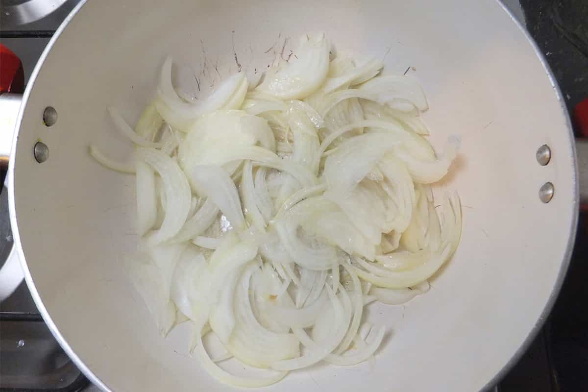 Para empezar, en una olla calentamos 2 cucharadas de manteca y agregamos la cebolla picada en pluma.