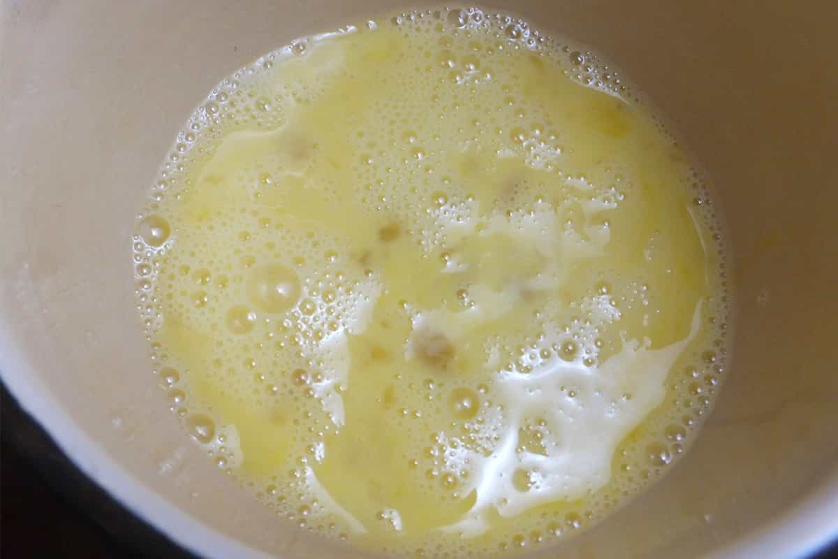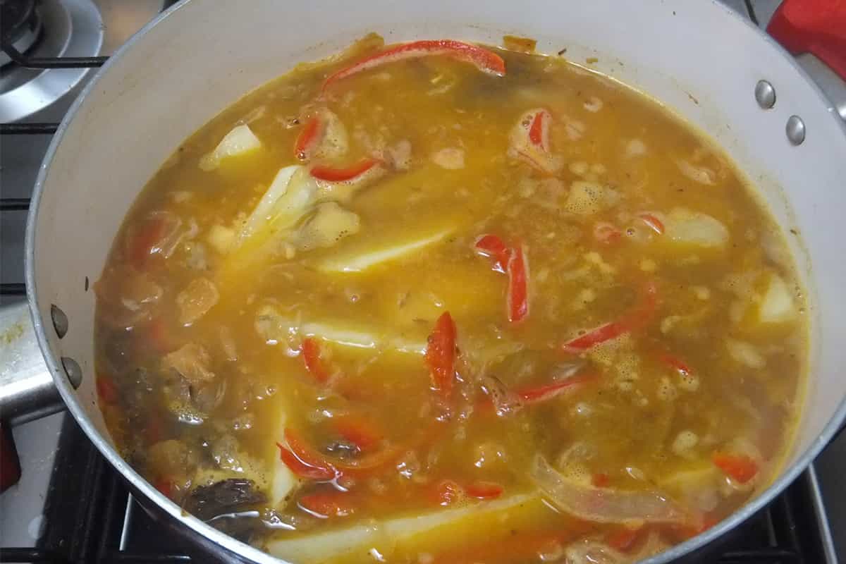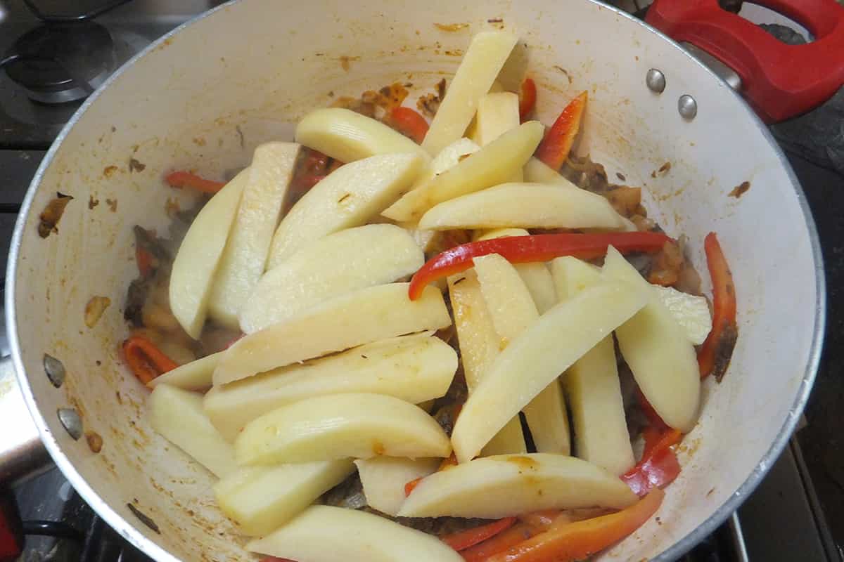 Esta preparación se cocina por unos 20 minutos a fuego medio, o hasta que las papas estén cocidas en su punto. En ese momento apagamos el fuego y agregamos los 4 huevos que previamente hemos batido.