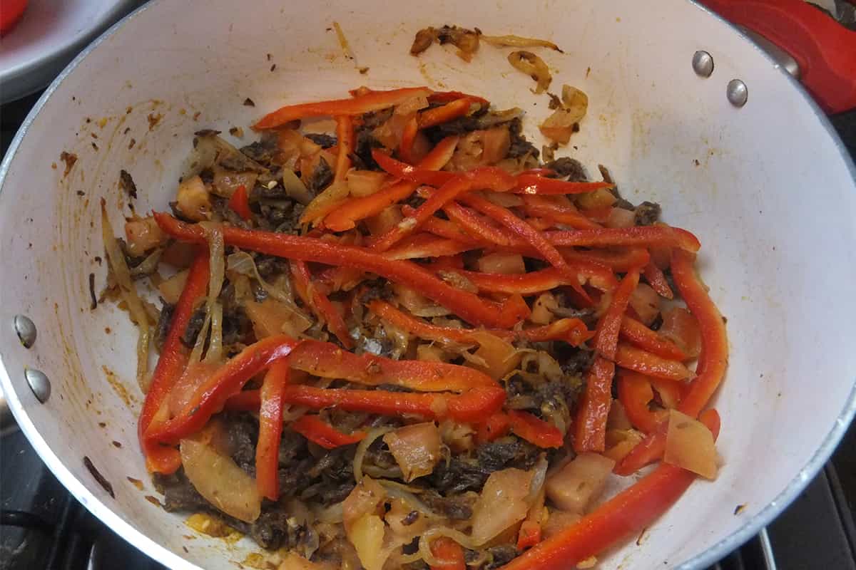 En un mortero, vamos a machacar los 2 ajos junto con 1 cdta. de comino, 1 cdta. de ají de color, 1/2 cdta. de merquén y 2 cdtas. de sal. Con esto la preparación queda muy poco picante pero, por supuesto, tú puedes variar los aliños de acuerdo a tu gusto. Debemos incorporar esta mezcla de condimentos a la olla y dejarlo cocinar por unos minutos para que vaya tomando sabor. Lo siguiente es agregar el pimentón picado en tiras, los 2 tomates en cubos pequeños y cocinar por unos 5 minutos.