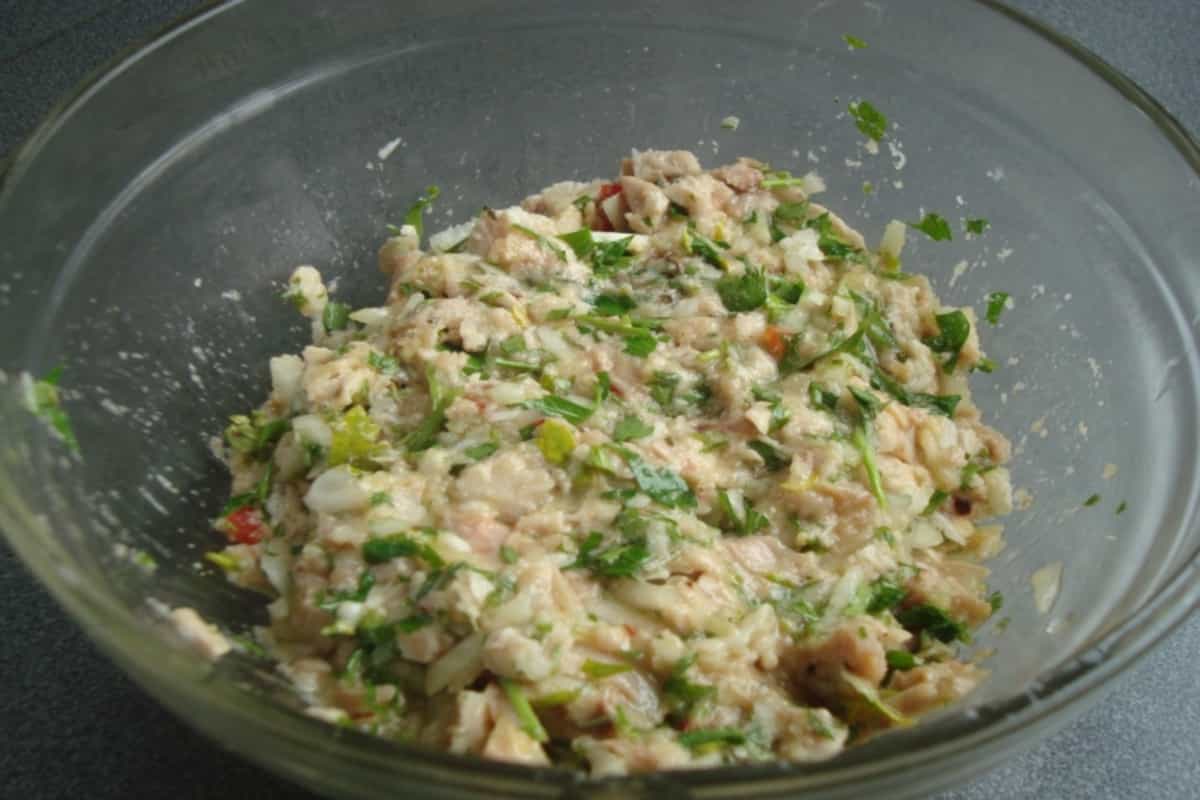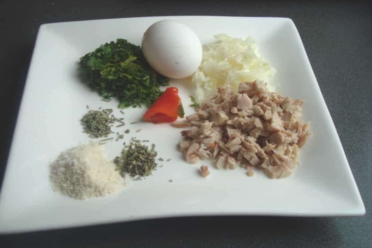 En un pocillo, mezclar el sofrito de verduras y pollo cocido desmenuzado. Incorporar 2 huevos, pan rallado, eneldo, orégano, ajinomoto y salpimentar a gusto. Revolver suavemente hasta obtener una preparación homogénea. Refrigerar por 30 minutos para que la mezcla repose.