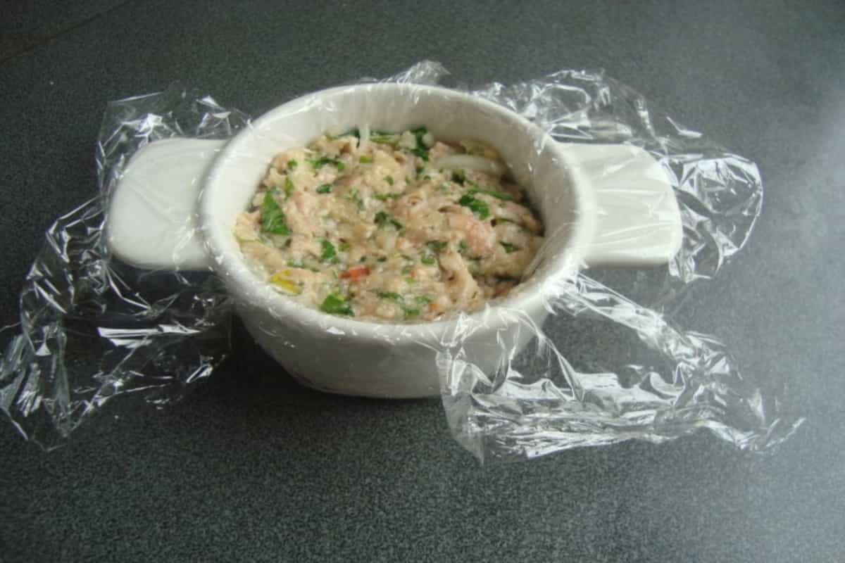 Transcurrido el tiempo de reposo de la mezcla, tomar porciones del tamaño deseado y vaciarlas en el pocillo forrado con papel alusa. Distribuir de manera uniforme y presionar levemente para compactar la hamburguesa.